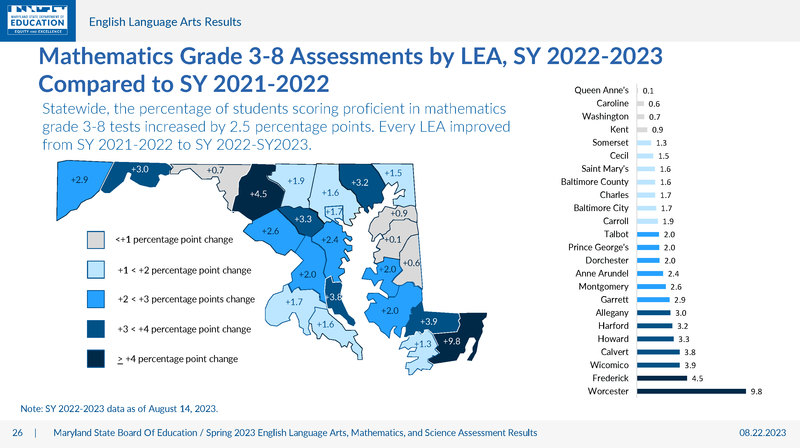 The full presentation of statewide scores can be viewed as a part of the State Board of Education’s livestream at https://marylandpublicschools.org/stateboard/Pages/meeting-agendas/2023/2023-08-22.aspx. The source material for the images used above is the document entitled “2023 Maryland Comprehensive Assessment Program English Language Arts, Mathematics, and Science Results” located on the same webpage.